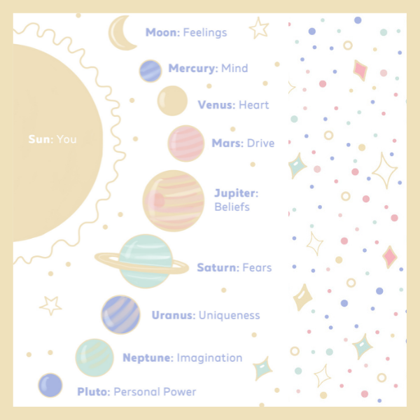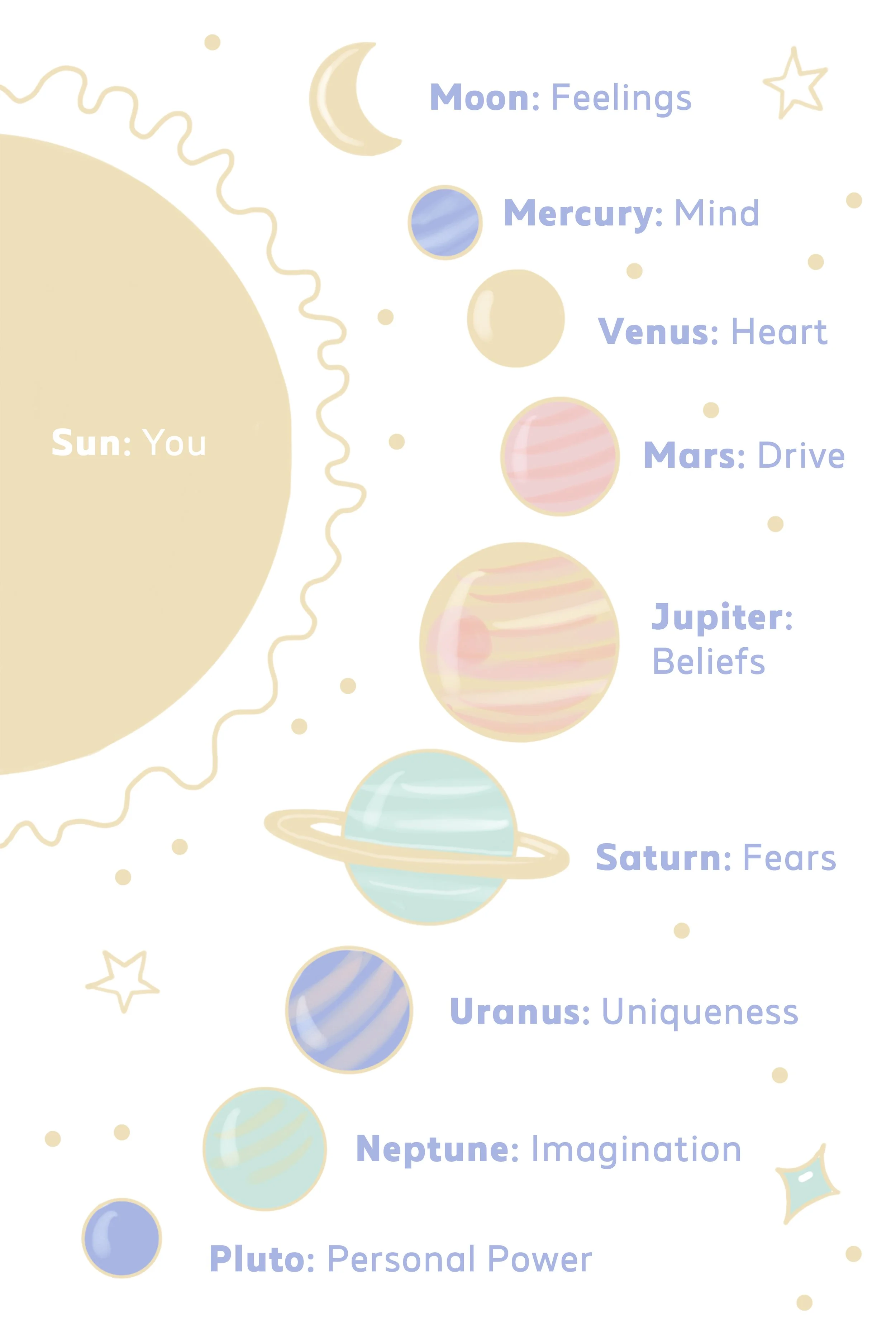 Sun represents you. It’s your sense of self and ego. It’s your basic character, identity and how you see yourself. It’s also your sense of purpose and how you are meant to shine in the world. It’s about how you are act and express yourself.