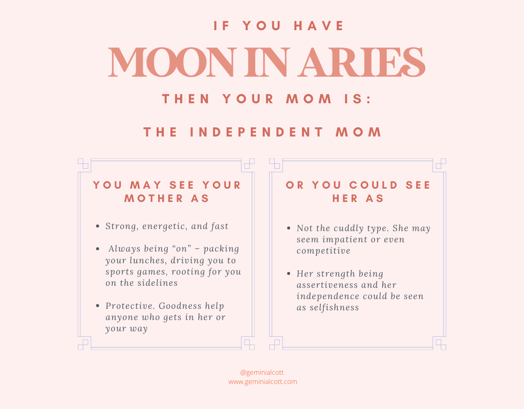 The zodiac sign connected to your Moon plays an important role in how you view her. It’s not her Sun sign. That’s different. She could be an Aries Sun IRL but you emotionally connect to her or view her through the zodiac sign of your Moon.
