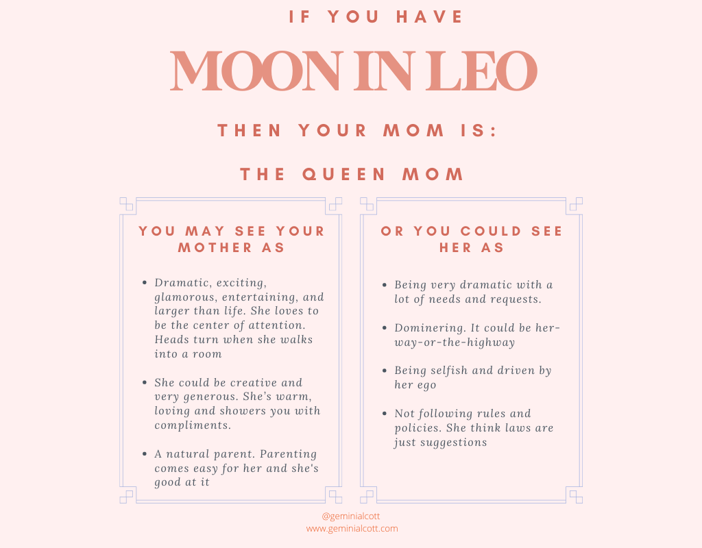 If you have a Capricorn Moon, you may see your mother as capable, hard-working, but possibly also strict and reserved. These are Capricorn traits. I’m getting Mommanager vibes. But if you have a Pisces Moon, you could see your mother as idealistic and compassionate, traditional Pisces qualities. She’d help you create a Spotify list and dance to it with you.