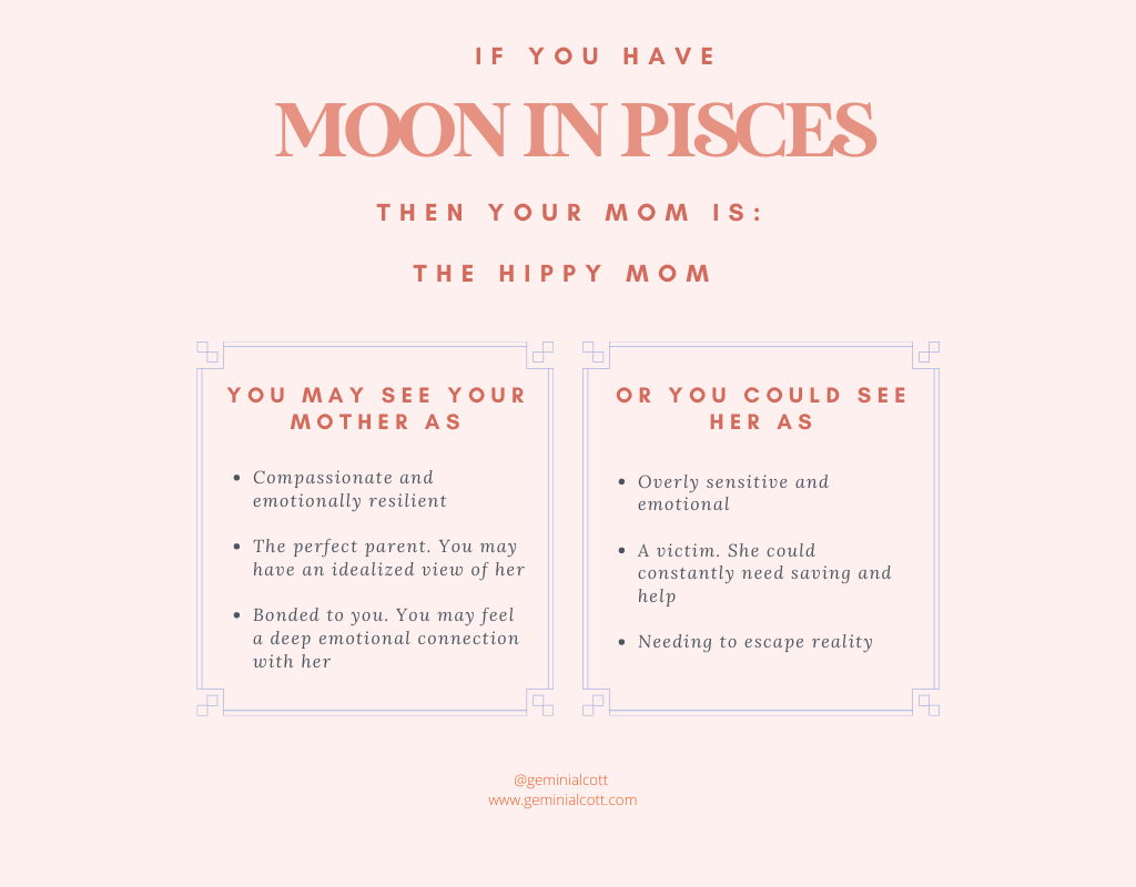 If you have a Capricorn Moon, you may see your mother as capable, hard-working, but possibly also strict and reserved. These are Capricorn traits. I’m getting Mommanager vibes. But if you have a Pisces Moon, you could see your mother as idealistic and compassionate, traditional Pisces qualities. She’d help you create a Spotify list and dance to it with you.