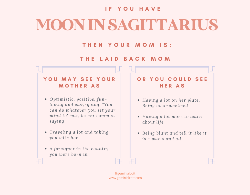 If you have a Capricorn Moon, you may see your mother as capable, hard-working, but possibly also strict and reserved. These are Capricorn traits. I’m getting Mommanager vibes. But if you have a Pisces Moon, you could see your mother as idealistic and compassionate, traditional Pisces qualities. She’d help you create a Spotify list and dance to it with you.