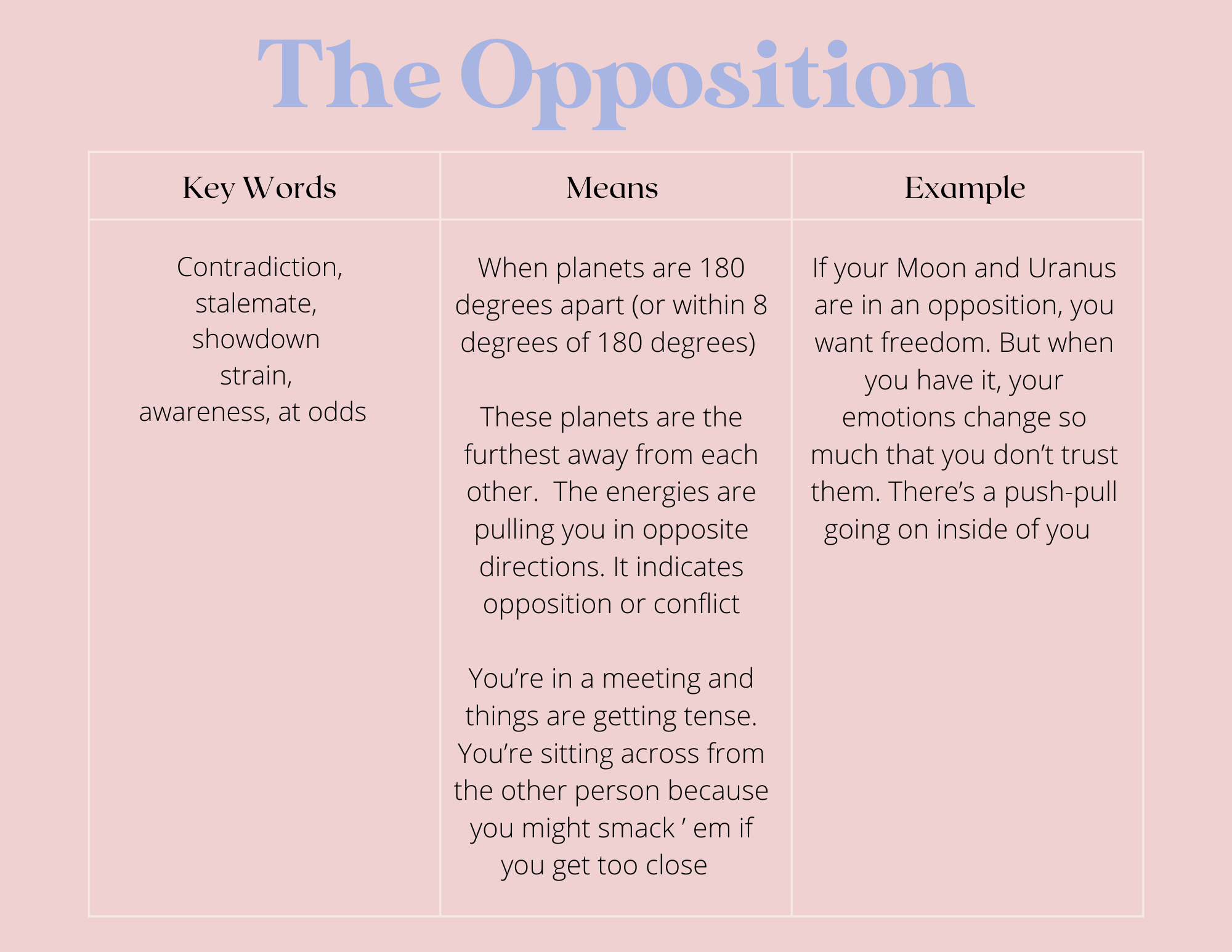 How does it manifest: These planets are the furthest away from each other. The energies are pulling you in opposite directions. It indicates opposition or conflict. You’re in a meeting and things are getting tense. You’re sitting across from the other person because you might smack ’ em if you get too close